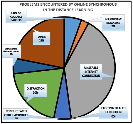 The graph shows that in 248 total population of grade five pupils under synchronous learning modality composed of 115 males and 133 females, 40% experiences instability in internet connection, 2% has insufficiency in data/load, 20% is distracted by their environment, 6 % lacks available gadgets, 5% has conflict with their other activities, and 27% of the pupils encountered other problems such as availability of the learning space and time management